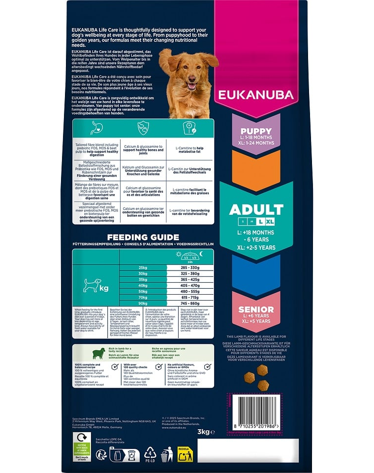 EUKANUBA Life Care egy prémium tápvonal, amely tudományos kutatások és táplálkozási szakértők tapasztalatai alapján készült, hogy pontosan azt nyújtsa a kutyáknak, amire szükségük van életük minden szakaszában. Ez a receptúra felnőtt nagytestű kutyák számára készült, akiknek szükségük van egy olyan étrendre, amely támogatja vitalitásukat, immunitásukat és ízületeik állapotát.