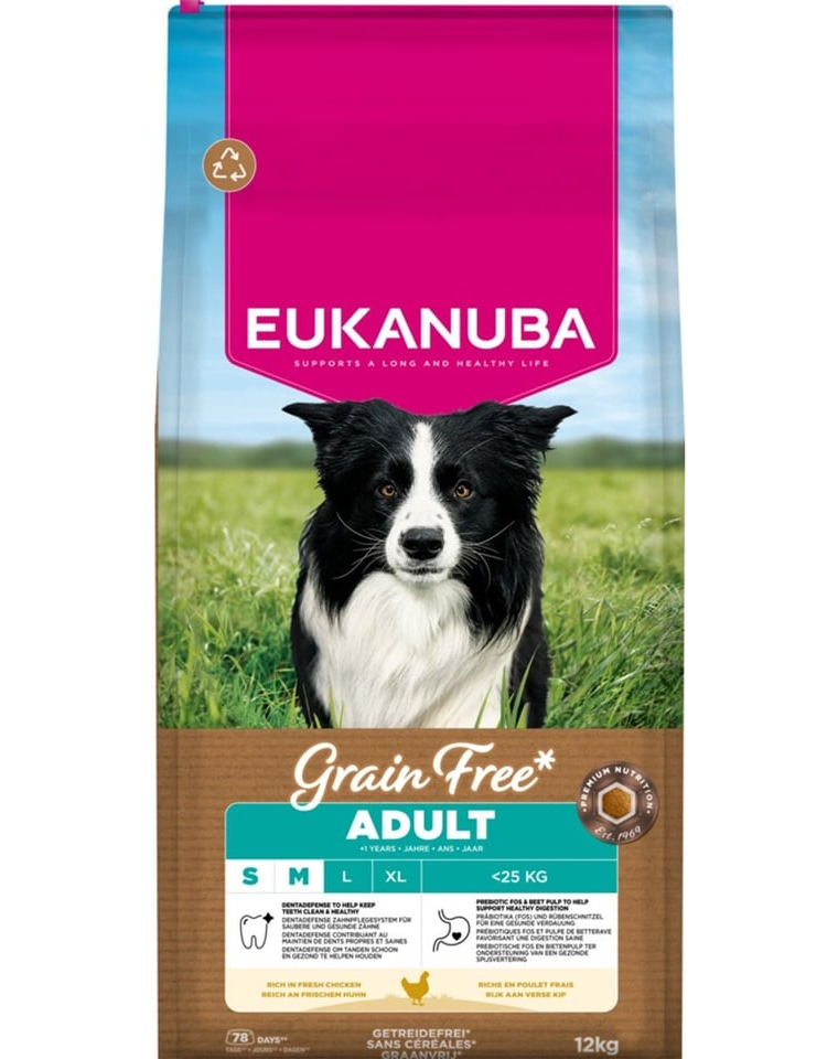 EUKANUBA Grain Free Adult Small & Medium Chicken egy teljes értékű, gabonamentes száraz táp felnőtt kicsi és közepes testű kutyák számára, 1 éves kor felett. A receptúra célja az optimális fizikai állapot, az egészséges emésztés és a jó közérzet fenntartása, különösen a gabonára érzékeny kutyák esetében.