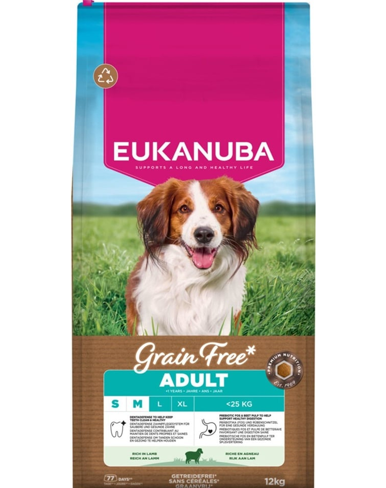 EUKANUBA Grain Free Adult Small & Medium Lamb egy teljes értékű, gabonamentes száraz kutyatáp, amely felnőtt kicsi és közepes fajtájú kutyák számára készült, 1 éves kor felett. Az alacsony allergén tartalmú receptúra érzékeny emésztőrendszerű kutyák számára készült, akik hajlamosak a gabonák intoleranciájára, támogatva mindennapi kondíciójukat és jó közérzetüket.