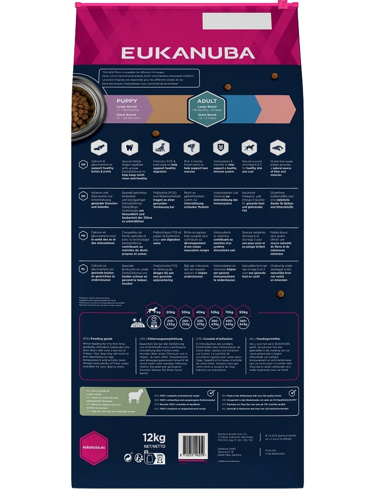 Az EUKANUBA friss fagyasztott bárányhúsban gazdag, gabonamentes szárazeledel felnőtt nagy és óriás fajtájú kutyák számára támogatja a zsírmentes izomzat fenntartását. Az összetételben antioxidánsok és vitaminok is szerepelnek a megfelelő immunrendszer működéséhez, valamint gluténmentes jamgyökér természetes rost- és ásványi anyagforrásként. Répapépet és FOS prebiotikumokat adtunk hozzá, hogy az eledel még hatékonyabban támogassa a megfelelő emésztést. A kalcium és a glükózamin hozzáadása viszont pozitív hatással van a csontok és az ízületek egészségére. Emellett a természetes forrásból származó Omega-6 és Omega-3 zsírsavak tartalma pozitív hatással van a bőr egészségére és a fényes szőrzetre. A pelletek speciális formája és az egyedülálló DentaDefense rendszer segít megőrizni a fogak egészségét és tisztaságát. Az EUKANUBA Grain Free eledel felnőtt nagy és óriás fajtájú kutyák számára 100%-ban teljes értékű és kiegyensúlyozott, így biztosítva kutyája jólétét.