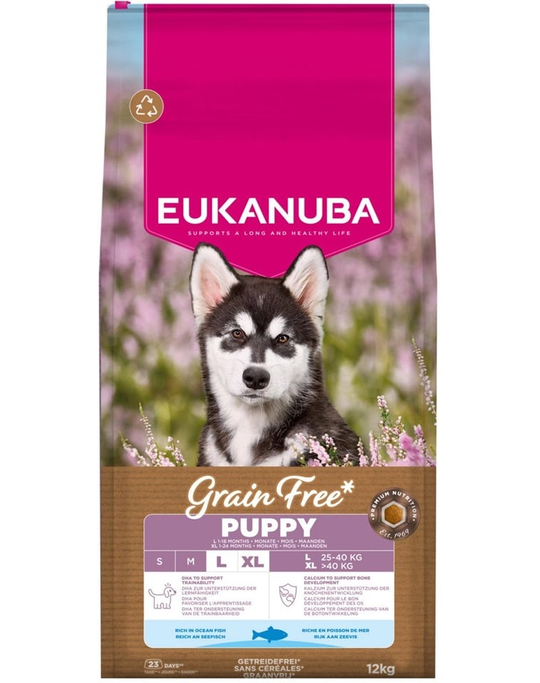 EUKANUBA Grain Free Puppy Large Ocean Fish egy teljes értékű, gabonamentes száraz táp, amely nagytestű kölyökkutyák számára készült, 1-18 hónapos korig, valamint óriásfajták számára 1-24 hónapos korig. A receptúra a nagyobb testtömegű növekvő kutyák speciális igényeinek figyelembevételével készült, támogatva a csontok, ízületek és izmok megfelelő fejlődését.