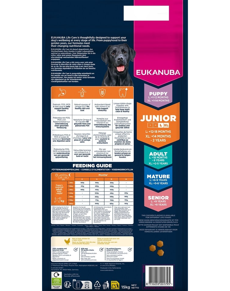 EUKANUBA Life Care egy prémium táp vonal, amely tudományos kutatások alapján készült, hogy teljes mértékben megfeleljen a kutya szervezetének változó igényeinek élete minden szakaszában. Ez a recept kifejezetten fiatal nagytestű kutyák számára készült 12-18 hónapos korig (vagy 14 hónaptól 2 éves korig óriás fajták esetén), amikor a csont- és izomfejlődés még folyamatban van, és a kutya fokozatosan belép a felnőttkorba.