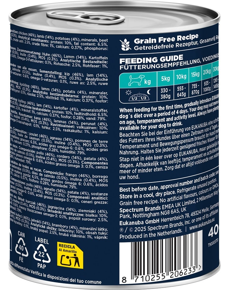 Összetevők: csirke (46%), bárányhús (14%), burgonya (4%), ásványi anyagok, cukorrépa pép (0.5%), lazacolaj (0.5%), inulin (0.4%), MOS (0.3%).