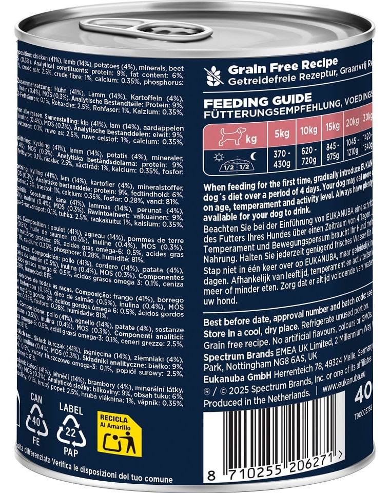 Összetevők: csirke (41%), bárányhús (14%), burgonya (4%), ásványi anyagok, cukorrépa pép (0.5%), lazacolaj (0.5%), inulin (0.4%), MOS (0.3%).