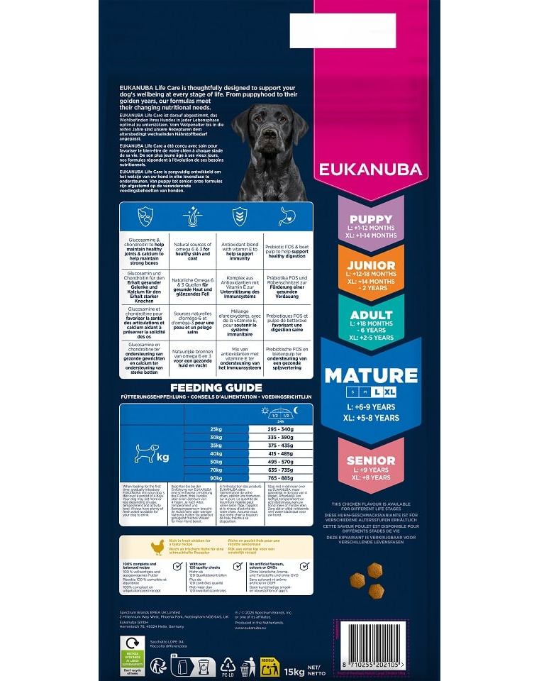 Az EUKANUBA Life Care egy prémium tápvonal, amely tudományos kutatások alapján készült, és amely a kutyák minden életkorának igényeire válaszol. Ez a táp kifejezetten 6–9 éves érett nagytestű kutyák számára készült (óriásfajták esetén: 5–8 év), értékes fehérjét biztosít friss csirkéből, valamint teljes értékű összetevőket, amelyek támogatják az egészséges öregedést és vitalitást.