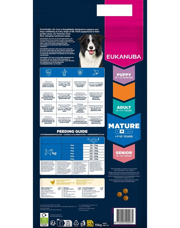 EUKANUBA Life Care egy prémium táp vonal, amely tudományos kutatások alapján készült, és támogatja a kutya egészségét életének minden szakaszában. Ez a táp érett közepes méretű kutyák számára készült, akik 7-10 évesek, értékes fehérjét biztosít friss csirkéből és teljes értékű tápanyagokat, amelyek támogatják a vitalitást és az egészséges öregedést.