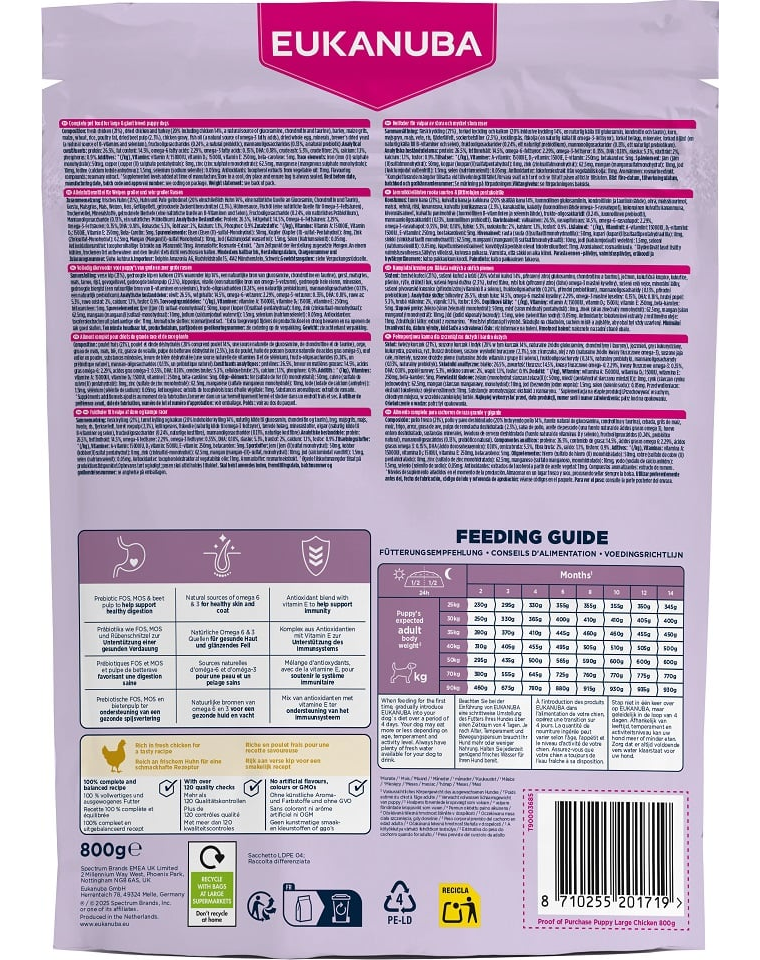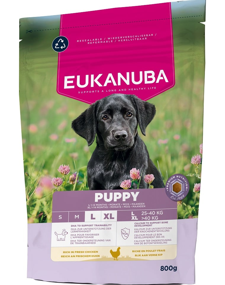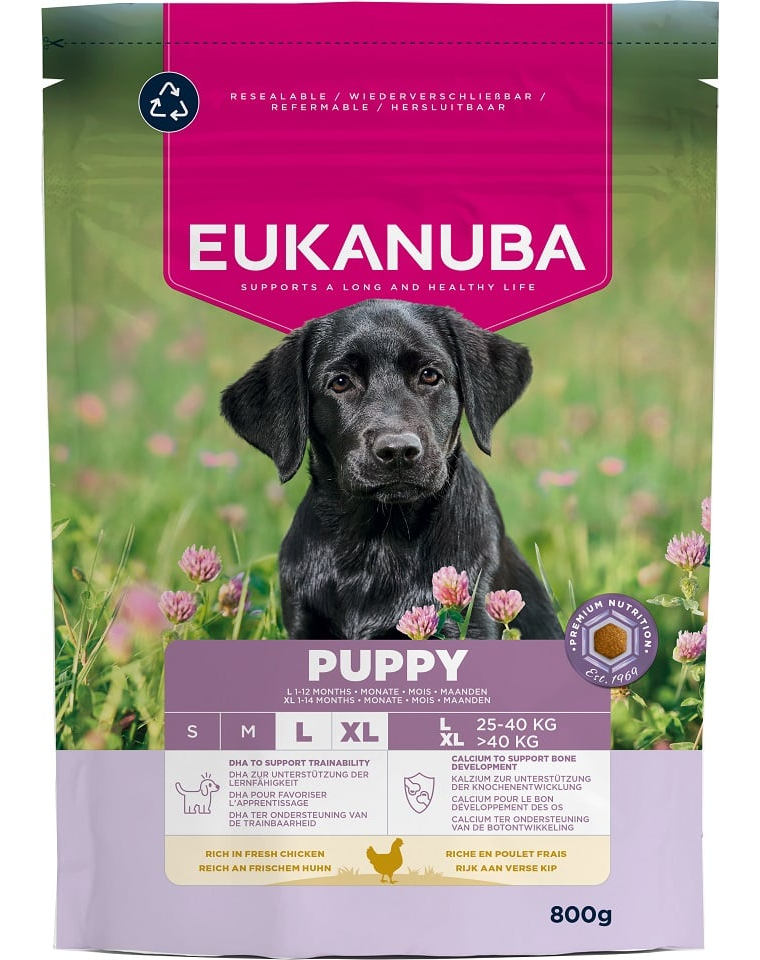 Ez a száraz táp EUKANUBA kölyökkutyáknak, friss csirkével gazdagítva, 100%-ban teljes és kiegyensúlyozott, és ideális a 1–12 hónapos (vagy óriás fajták esetén 1–14 hónapos) nagytestű kutyák számára.