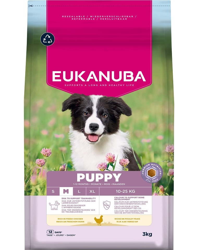 EUKANUBA Puppy Medium Breeds Chicken – száraz táp közepes fajtájú kölyökkutyáknak, friss csirkével gazdagítva