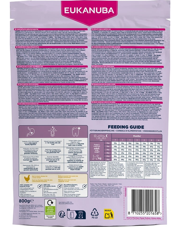 Ez a száraz táp az EUKANUBA-tól közepes fajtájú kölyökkutyák számára készült, 1-12 hónapos korig. Alapját friss csirke képezi, amely teljes értékű fehérjeforrás, támogatva a fiatal kutya izmainak fejlődését és megfelelő kondícióját.
