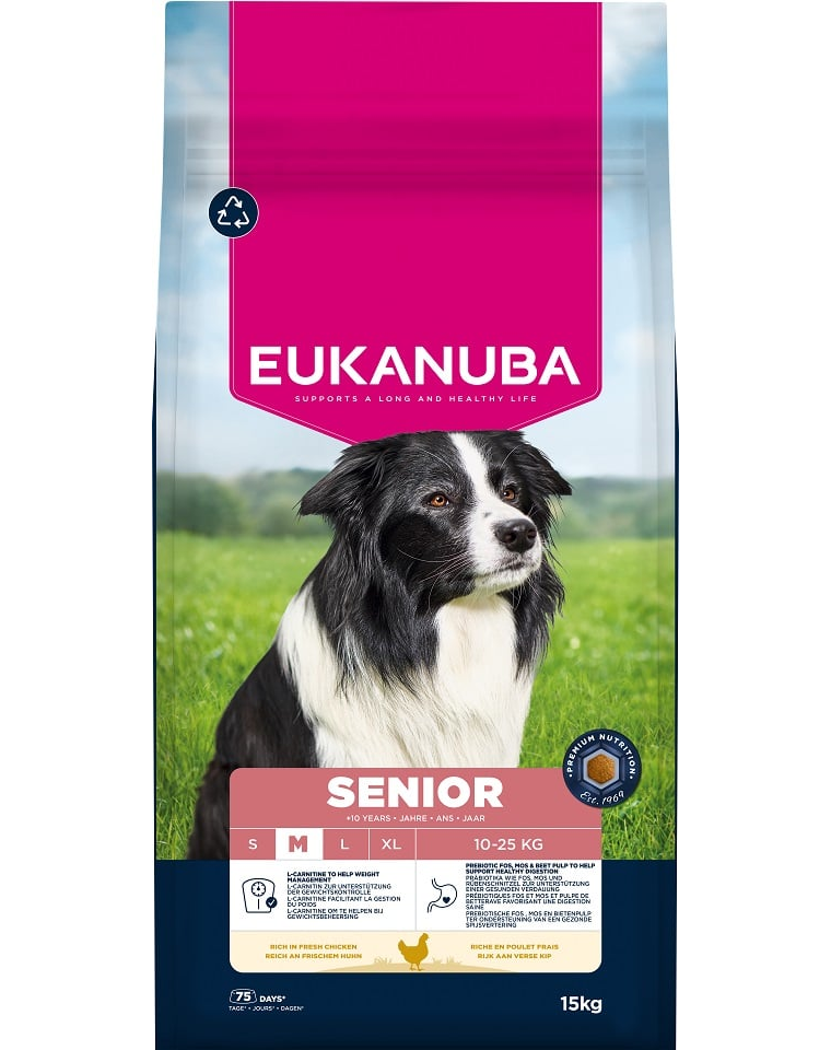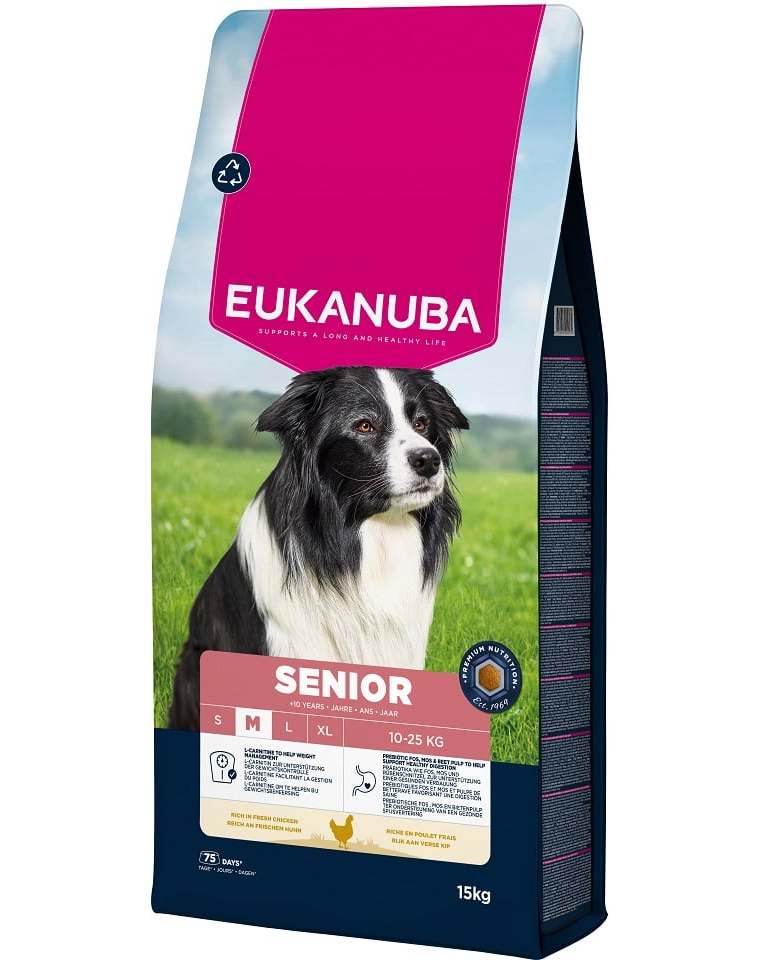 A EUKANUBA száraz táp idősebb kutyák számára, friss csirkével gazdagítva, 100%-ban teljes és kiegyensúlyozott, és ideális közepes testű kutyák számára, akik 10 évesnél idősebbek.