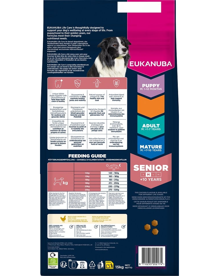 Az idősebb közepes testű kutyáknak olyan étrendre van szükségük, amely támogatja az egészséget és a vitalitást minden nap. Az EUKANUBA Life Care-t szakértők fejlesztették ki az ő igényeik figyelembevételével – a friss csirkén alapuló formula magas minőségű fehérjét biztosít, amely fenntartja az izomerőt és energiát ad a napi aktivitáshoz.