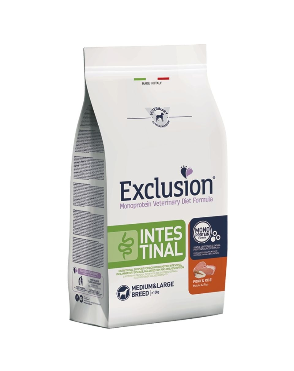 Az Exclusion Monoprotein Veterinary Diet Formula Intestinal egy monoprotein diétás eledel, amely egy alternatív állati fehérjeforrásból és egyéb innovatív összetevőkből készül, természetes tokoferolokkal tartósítva. Többféle méretben kapható, és olyan állatorvosok számára jelent táplálkozási megoldást, akik tápanyagtámogatást kívánnak nyújtani a gyomor-bélrendszeri betegségben, emésztési zavarokban és felszívódási zavarban szenvedő kutyáknak.