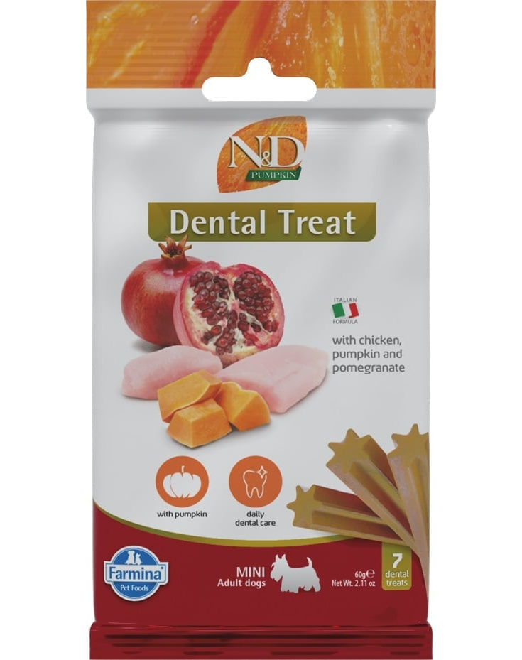 FARMINA N&D Pumpkin — a legmagasabb minőségű fogápoló falat, amelyet kisméretű kutyák számára fejlesztettek ki, hogy támogassa a szájhigiénét és egyben gondoskodjon kedvence általános jóllétéről. A formula 96%-ban állati eredetű, magas minőségű fehérjét tartalmaz, ami biztosítja a tápanyagok kiváló felszívódását és elősegíti az egészséges kondíció fenntartását. A falat teljes értékű és kiegyensúlyozott, gabonamentes és mesterséges tartósítószerektől mentes, így biztonságos még érzékeny emésztőrendszerű kutyák számára is.