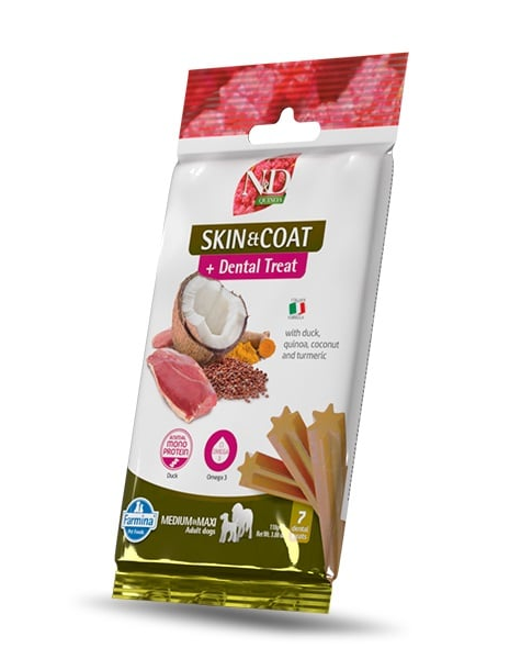 Farmina N&D Quinoa Skin & Coat Duck ez egy funkcionális jutalom, amely korlátozott összetevőkből készült, támogatja a bőr egészségét és javítja a szőrzet megjelenését. 11%-os kacsafehérjét tartalmaz – könnyen emészthető és hipoallergén forrást, amely minimalizálja az intolerancia és allergiás reakciók kockázatát. A quinoa (8%) rostot és ásványi anyagokat biztosít, segítve a megfelelő emésztést. A kurkuma (2,5%) gyulladáscsökkentő hatású és erősíti az immunitást, míg a kókusz (2,5%) értékes közepes láncú zsírsavakat biztosít, amelyek kedvezően hatnak a bőr állapotára. A termék gazdag Omega-3 zsírsavakban, amelyek jótékony hatással vannak a szőr minőségére és a bőr egészségére. A jutalom különleges szerkezete segít csökkenteni a lepedéket és friss leheletet biztosít.