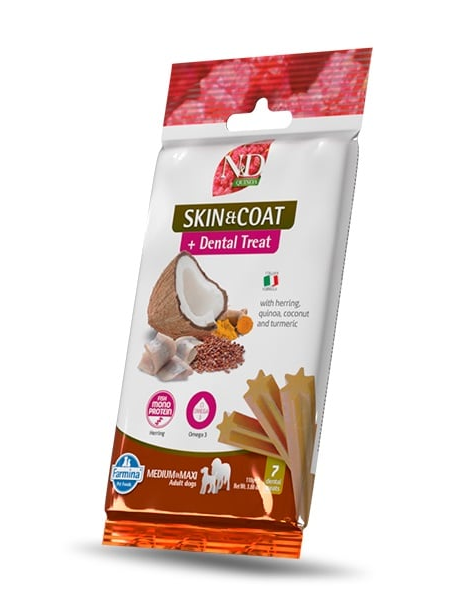 Farmina N&D Quinoa Skin & Coat Herring egy funkcionális jutalom, amelyet bőrproblémákkal, allergiákkal és táplálékérzékenységgel küzdő kutyák számára fejlesztettek ki. 10%-os fehérjetartalmával, amely kizárólag heringből származik, minimalizálja az allergiás reakciók kockázatát. A quinoa, amely a keverék 8%-át teszi ki, rostot, antioxidánsokat biztosít, és támogatja az emésztést. A természetes kurkuma (2,5%) gyulladáscsökkentő hatású és ellensúlyozza az oxidatív stresszt, míg a kókusz (2,5%) egészséges zsírokat biztosít, amelyek segítik a bőr regenerálódását. A jutalom gazdag Omega-3 zsírsavakban, amelyek javítják a bőr rugalmasságát és egészséges fényt adnak a szőrnek. A speciális fogápoló szerkezet segít megőrizni a fogak tisztaságát és a friss leheletet, ötvözve a szájhigiénia iránti gondoskodást a kutya bőrének és szőrének napi ápolásával.