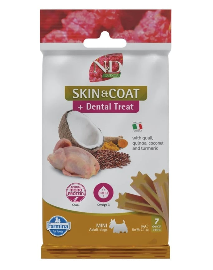 FARMINA N&D Quinoa Skin & Coat fürjjel egy funkcionális fogápoló jutalom, amelyet kifejezetten allergiás és bőrproblémás kutyák számára fejlesztettek ki.