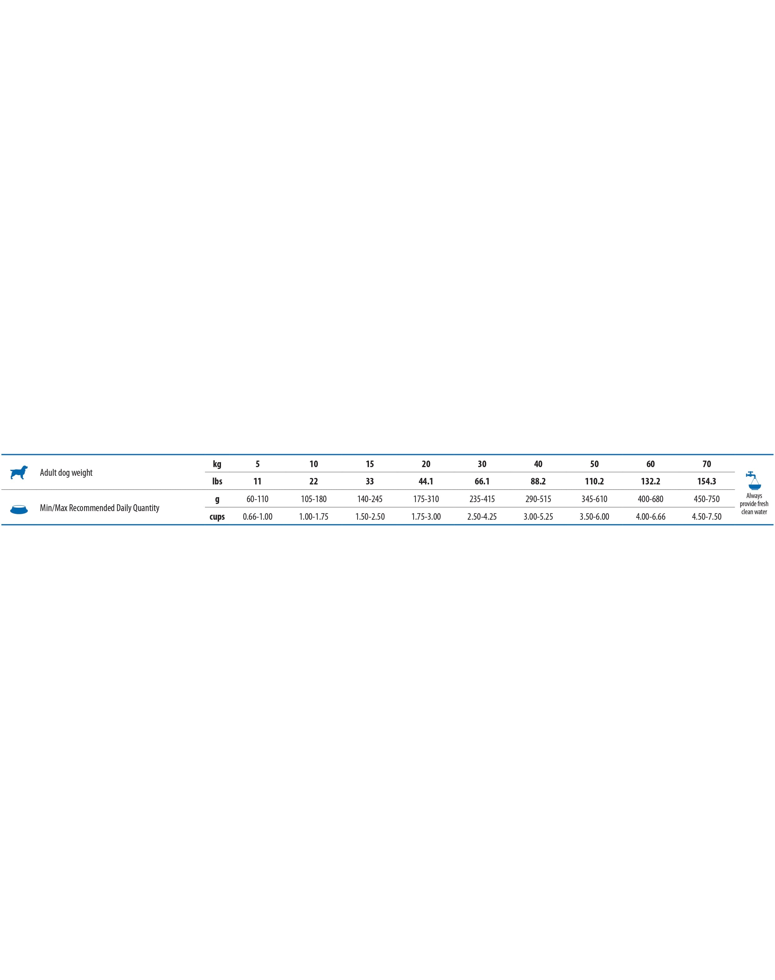 nyersfehérje 23,00%; nyerszsír 12,00%; nyersrost 2,80%; nedvességtartalom 9,00%; nyershamu 7,90%; kalcium 1,10%; foszfor 0,90%; Omega-3 zsírsavak 0,40%; Omega-6 zsírsavak 2,20%; DHA 0,20%; EPA 0,10%; glükozamin 1200mg/kg; kondroitin-szulfát 900mg/kg.