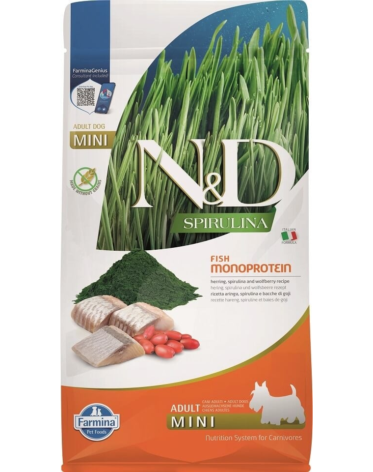 Teljes értékű táplálék a N&D Spirulina termékcsaládból, felnőtt kis kutyák számára. Az aromás heringszardínia, a tápláló spirulina és a goji bogyók kombinációja kiváló választás azoknak a kutyáknak, akik értékelik az ízt és az egészséget.