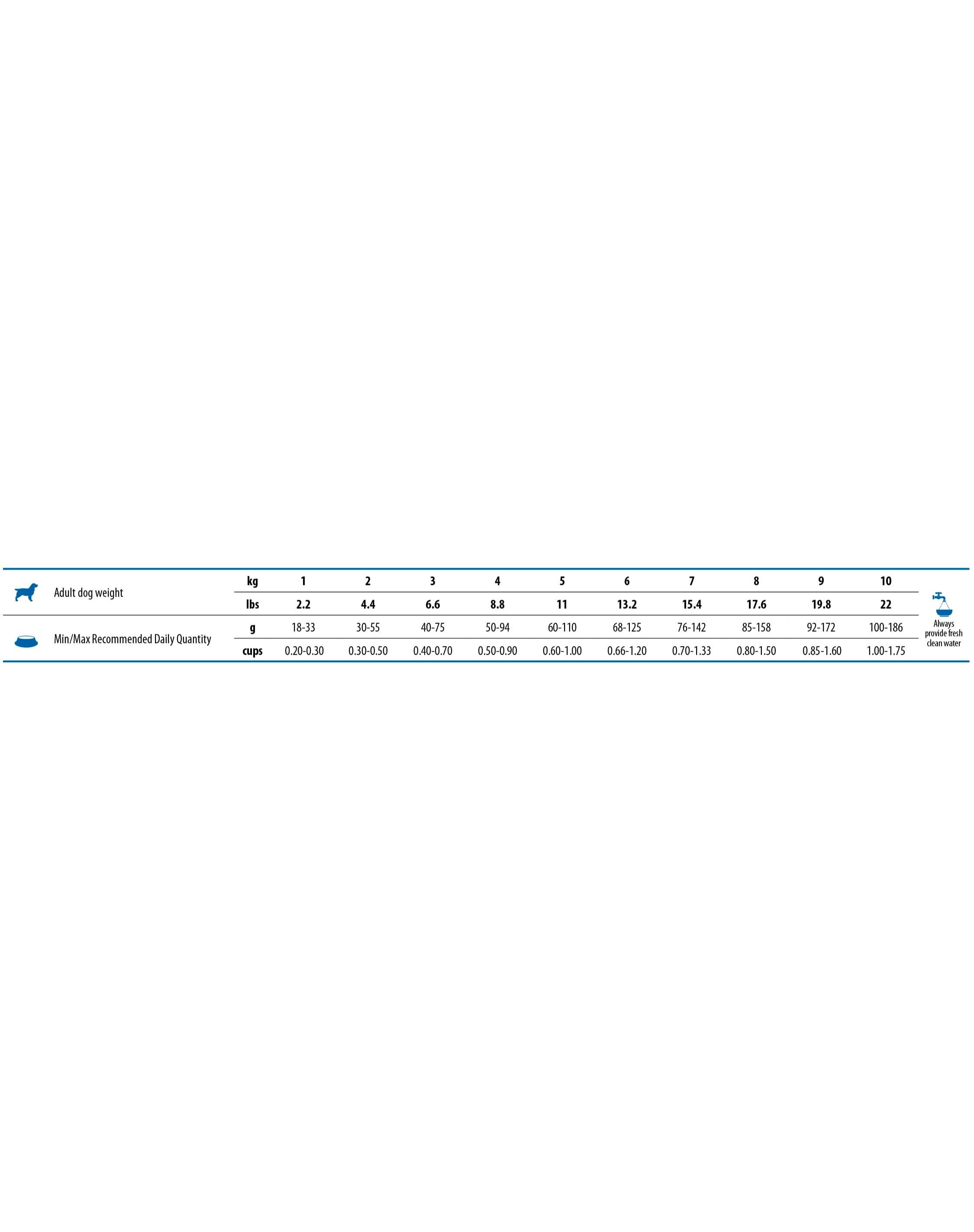 Nyersfehérje 23,00%; nyerszsír 18,00%; nyersrost 2,90%; nedvesség 9,00%; nyershamu 7,90%; kalcium 0,90%; foszfor 0,80%; Omega-6 1,60%; Omega-3 2,30%; DHA 1,00%; EPA 0,70%; glükozamin 1200mg/kg; kondroitin-szulfát 900mg/kg.