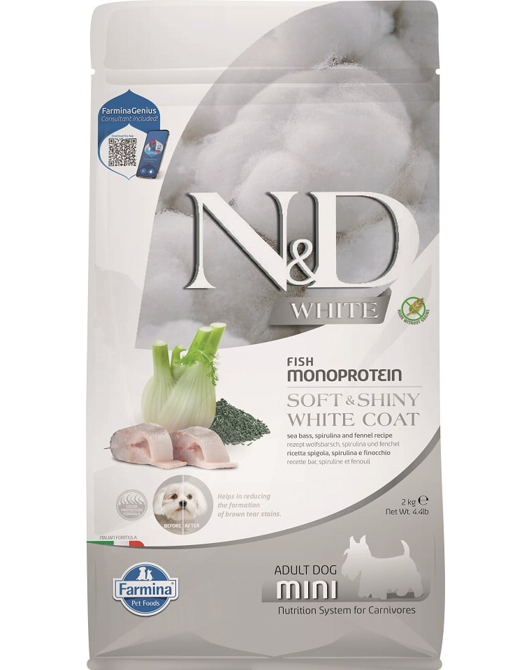 Teljes értékű eledel felnőtt, kistestű kutyák számára tengeri sügérrel, spirulinával és édesköménnyel.