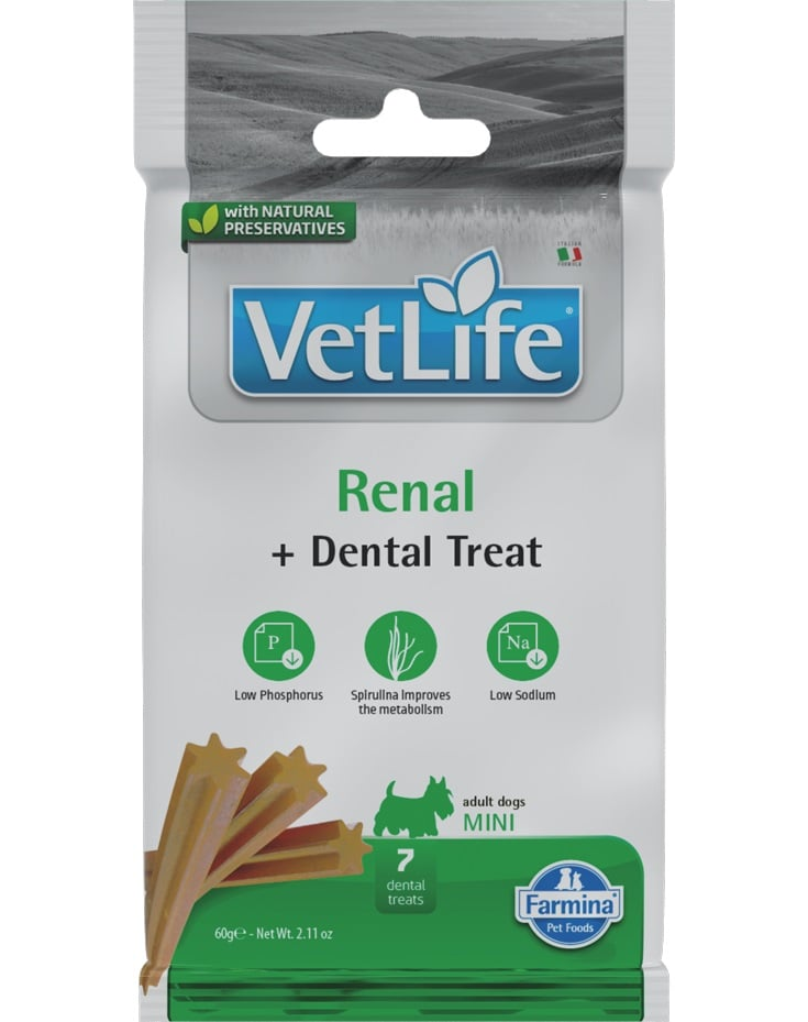 Farmina Vet Life Dental Treat Renal Mini egy funkcionális dentális jutalomfalat kutyák számára 4 hónapos kor felett, amelyet kifejezetten a vesék működésének támogatására fejlesztettek ki.