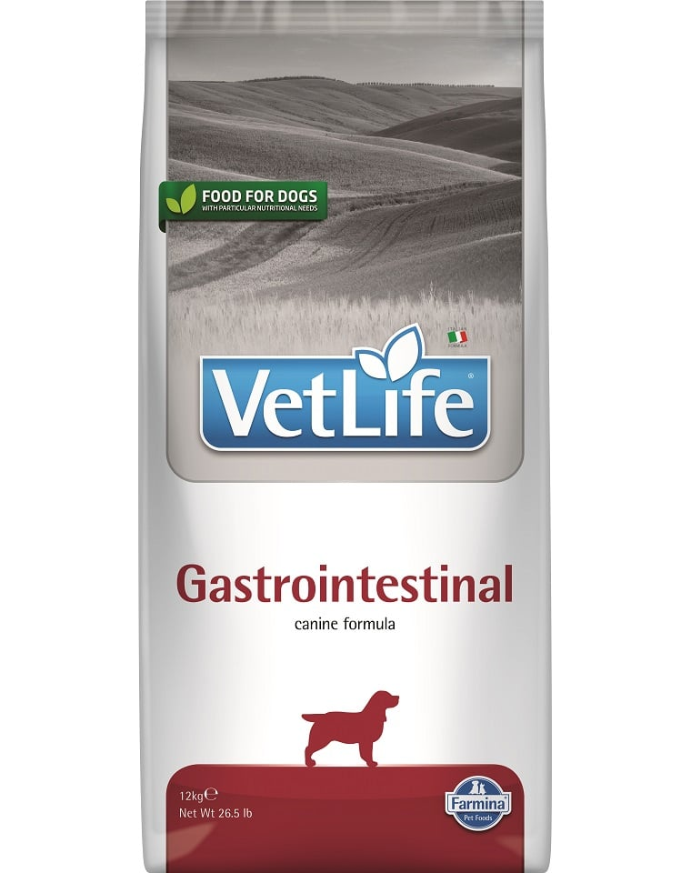 A Farmina Vet Life Gastro-Intestinal egy könnyen emészthető eledel, amely segít helyreállítani a természetes bélflórát és mikrofaunát, és oldható rosttartalmának köszönhetően védi a bélnyálkahártyát. Ez a könnyen emészthető eledel korlátozott hasnyálmirigy-enzimaktivitással rendelkező kutyáknak, valamint akut hasnyálmirigy-gyulladásban szenvedő (nem hiperlipidémiás) kutyáknak is ajánlott a kezdeti szakasz után, amikor a kutya elkezdi felvenni a táplálékot és a vizet. Ez a könnyen emészthető eledel a kutya fenntartásához szükséges táplálék mennyiségének csökkentésére is javallott megnagyobbodott gyomor és torpor esetén. Ezekben az esetekben naponta hatszor etesse kutyáját kis mennyiségű táplálékkal.