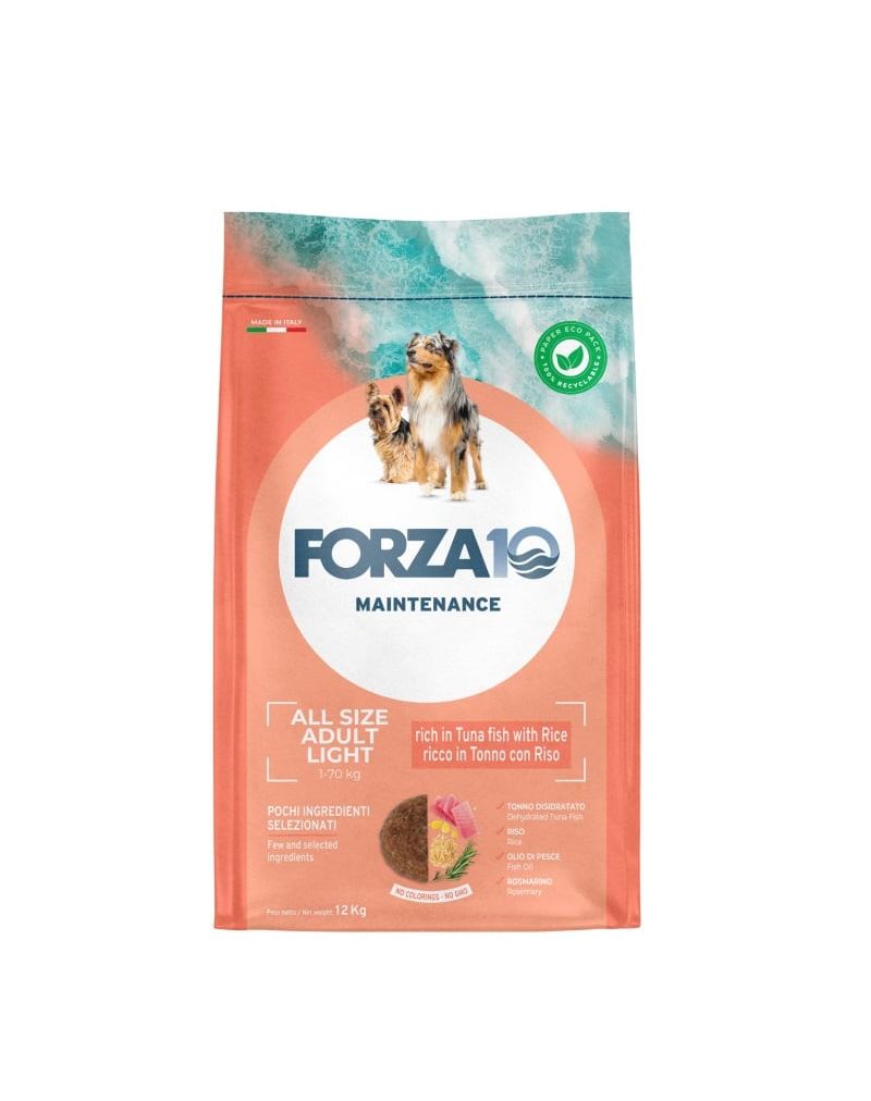 A Forza10 Maintenance Light tonhalat és rizst tartalmaz, és teljes értékű eledel minden fajta felnőtt kutyának. A tonhalhús szinte zsírmentes, a halolaj és a kukoricaolaj pedig jótékonyan hat a szőrzetre és a bőrre, valamint a szív- és érrendszer és az idegrendszer jó működésére. Az alacsony zsírtartalom segít a koleszterinszint szabályozásában. Formuláját idősebb, kevésbé aktív vagy túlsúlyos kutyák számára fejlesztették ki.