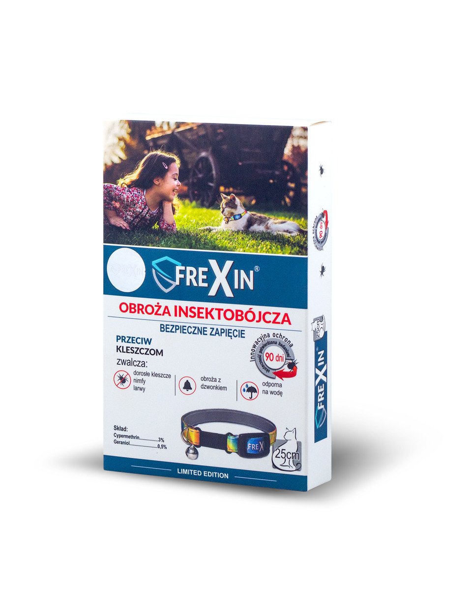 Rovarirtó nyakörv csengővel macskáknak. A nyakörvet 3 hónaposnál idősebb macskák kullancs elleni védekezésére tervezték.