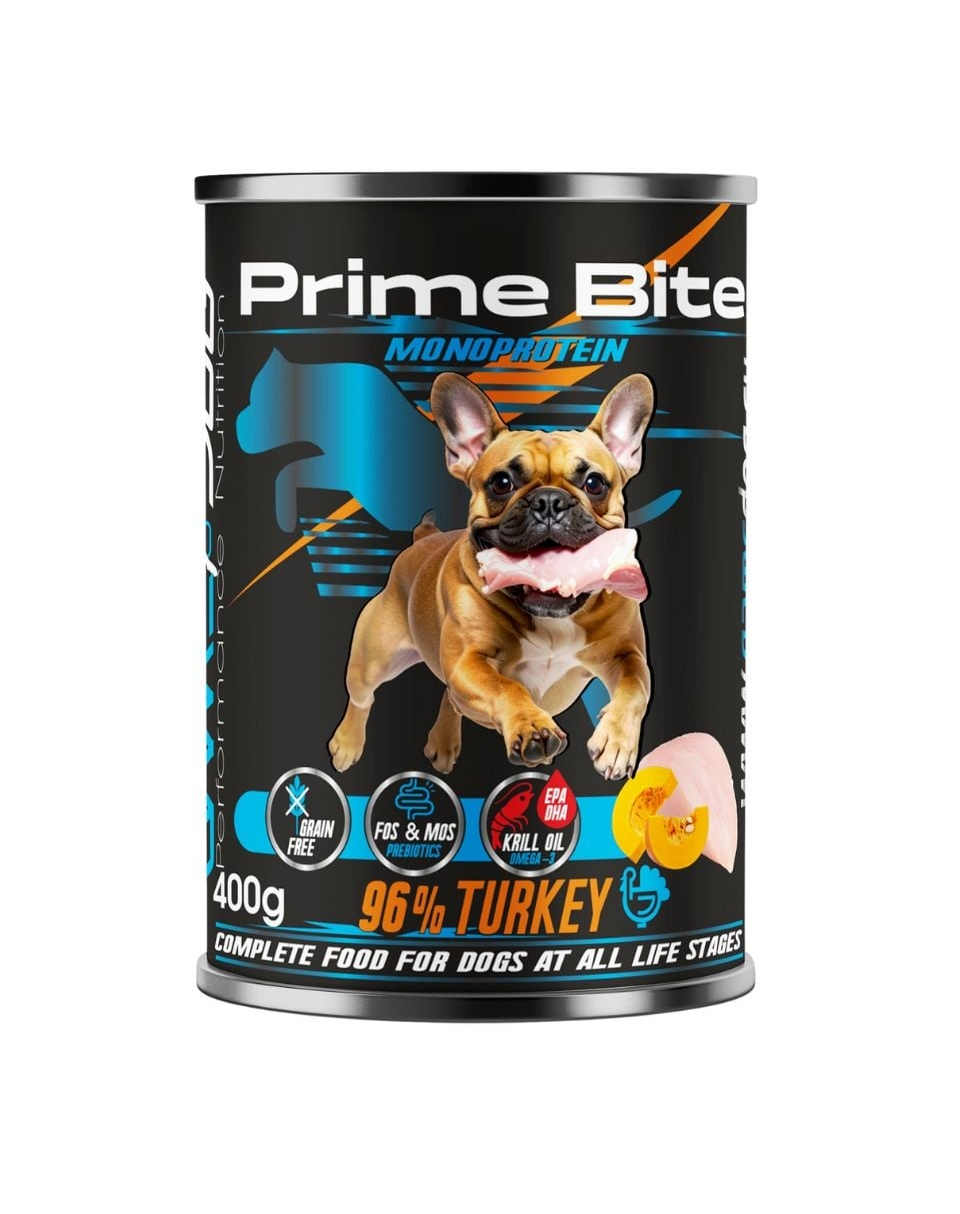Minden Prime Bite konzerv 96 % állati eredetű összetevőt tartalmaz, beleértve 80 % izomhúst és 16 % természetes pulykalevest. A pulykahús könnyen emészthető, finom és gazdag aminosavakban, ami kiváló fehérjeforrássá teszi a különböző igényű kutyák számára. A monoprotein formula csökkenti az allergiás reakciók kockázatát és támogatja a diéta ellenőrzését.