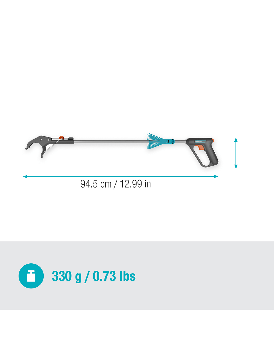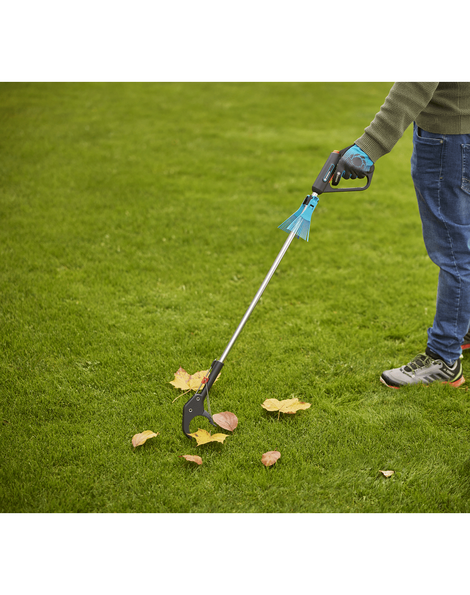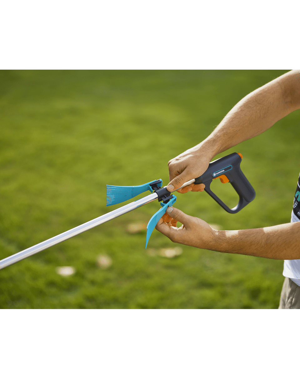 A hátbarát, multifunkcionális markoló a kerti hulladék, szemét és nehezen hozzáférhető tárgyak összegyűjtéséhez. Ergonómikus lombgereblyézéshez is alkalmas. Egyszerűen csatlakoztassa a gereblyét, nyomja meg a gombot és fordítsa el a markolófejet. A fémkaparók kiválóan alkalmasak a szennyeződések eltávolítására a kemény felületekről. A rozsdamentes acél nyársak nagyszerűek a rothadt gyümölcsök felemelés nélküli felszedéséhez.