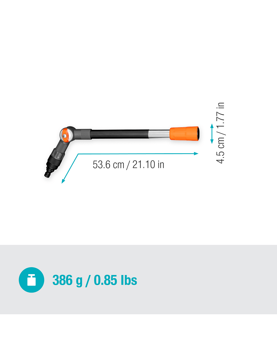 A GARDENA Flex nyéllel 53 cm-rel megnövelhető a tisztítási sugár. Ezáltal a magasabb, vízszintes felületek, például teraszok vagy garázstetők tisztítása gyerekjátékká válik. Ez azt jelenti, hogy a nyelet segédeszközök, például létra nélkül használhatja. A fogantyú kiváló minőségű, tartós alumíniumból készült, és kényelmes tapintású bevonattal van ellátva.