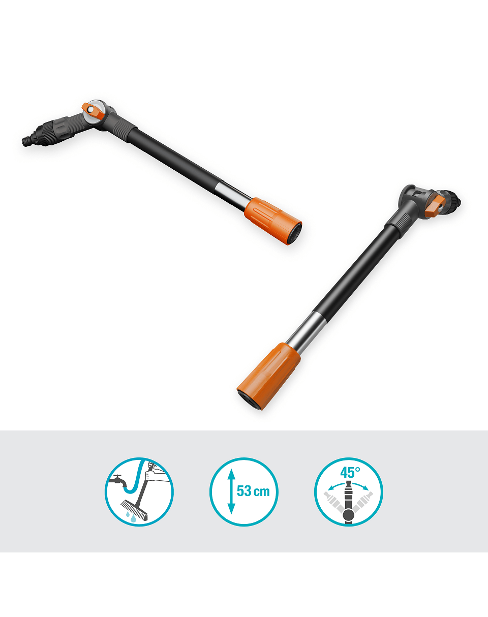 A nyél mindkét oldala 45°-os szögben dönthető, így könnyedén tisztíthatók a magasabb felületek, például az üvegház vagy a lakókocsi teteje. A Flex nyél egy másik Cleansystem nyéllel együtt könnyen csatlakoztatható a kerti tömlőhöz hosszabbításként.