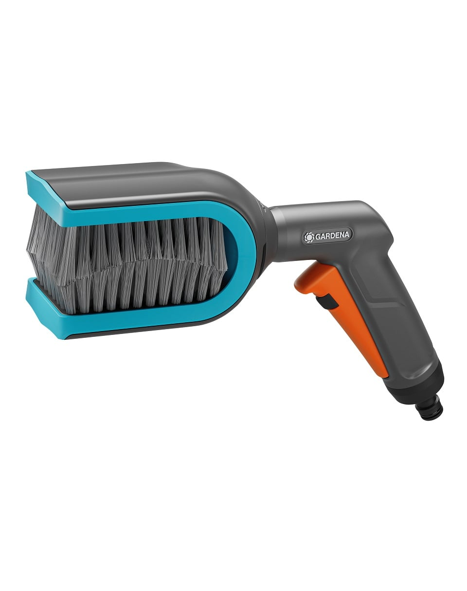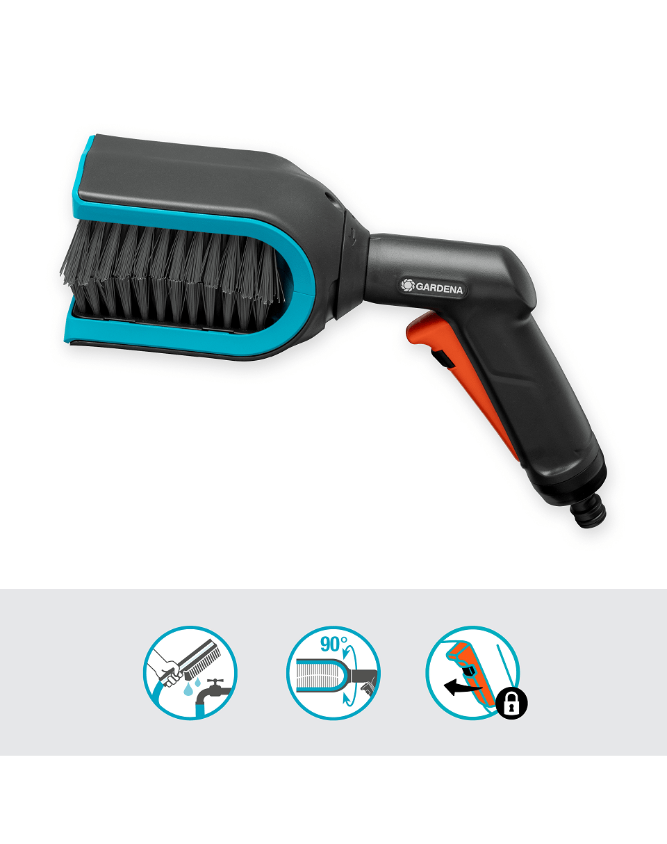 A szegélyléctisztító kefe közvetlenül a vízellátáshoz csatlakozik, így nagy kényelmet és azonnali eredményt biztosít. Nem kell állandóan nyomogatni a gombot a folyamatos vízáramlás biztosításához. Az állandó reteszelő mechanizmus megakadályozza a kéz elfáradását. A vízáramlás leállításához nyomja meg a kefén lévő gombot.