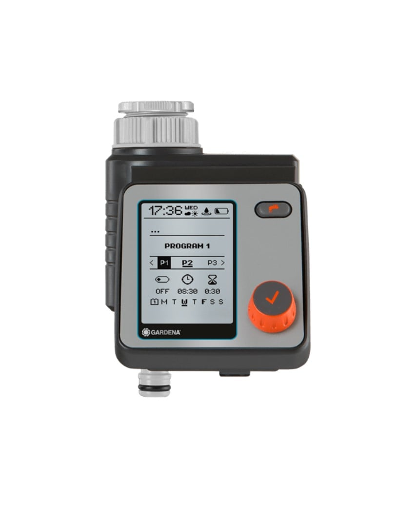 A készülék lehetővé teszi az egyéni és víztakarékos öntözést. Akár hat különböző és egymástól független ütemezés is programozható. A tápellátás akkumulátorról történik. Közvetlenül a vízcsaphoz csatlakoztatható, és egy kényelmes tárcsával vezérelhető, a kiválasztás érvényesítésére szolgáló nyomógombos funkcióval. Világos kijelzővel van felszerelve, amely minden beállítást megjelenít. A menü 10 nyelven jeleníthető meg. A vezérlőegység időjárásálló, és a vezérlő kényelmesebb programozása érdekében leválasztható a készülék többi részéről. A felhasználó egyszerre módosíthatja az összes program öntözési idejét. Az "Eső kikapcsolása" funkció rossz idő esetén leállítja az öntözést. Lehetőség van GARDENA talajnedvesség-érzékelő csatlakoztatására.