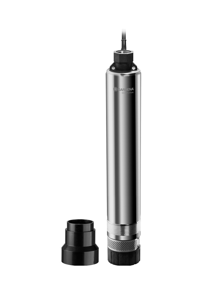 Az 5500/5 rozsdamentes acélból készült merülőszivattyú alkalmas 10 cm átmérőjű kis kutakhoz (fúrt vagy hajtott).