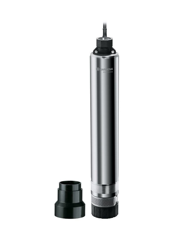 A 6000/5 rozsdamentes acélból készült merülőszivattyú alkalmas 10 cm átmérőjű kis kutakhoz. (fúrt vagy hajtott).