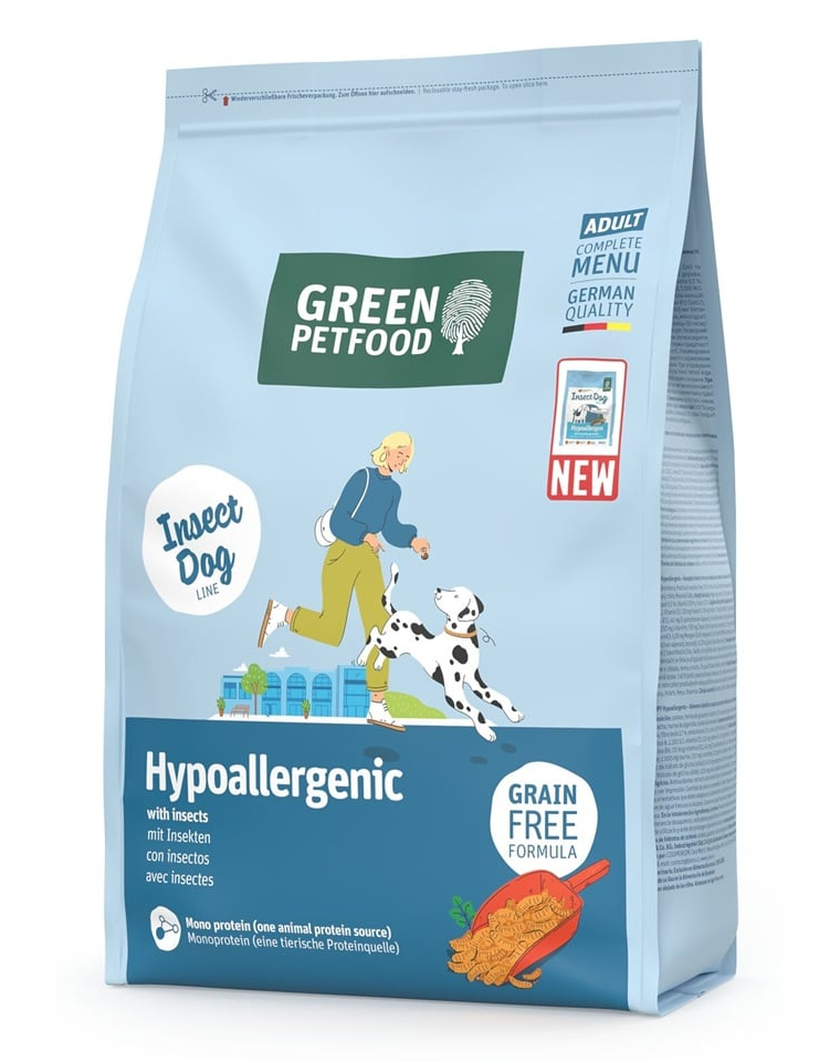 Gabonamentes, hipoallergén száraz táp GREEN PETFOOD InsectDog Hypoallergenic> teljes értékű étkezés felnőtt kutyák számára, kifejezetten érzékeny emésztőrendszerű és allergiás hajlamú állatok számára készült.