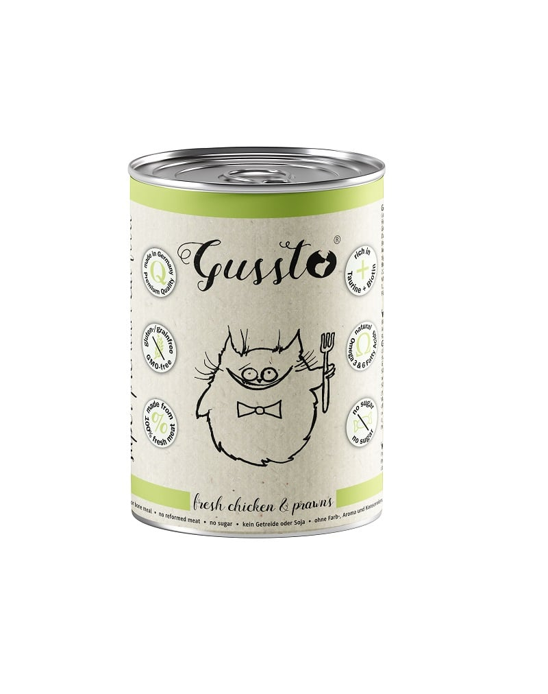 A Gussto Fresh Chicken Prawns egy kiváló minőségű, teljes értékű és tökéletesen kiegyensúlyozott macskatáp.