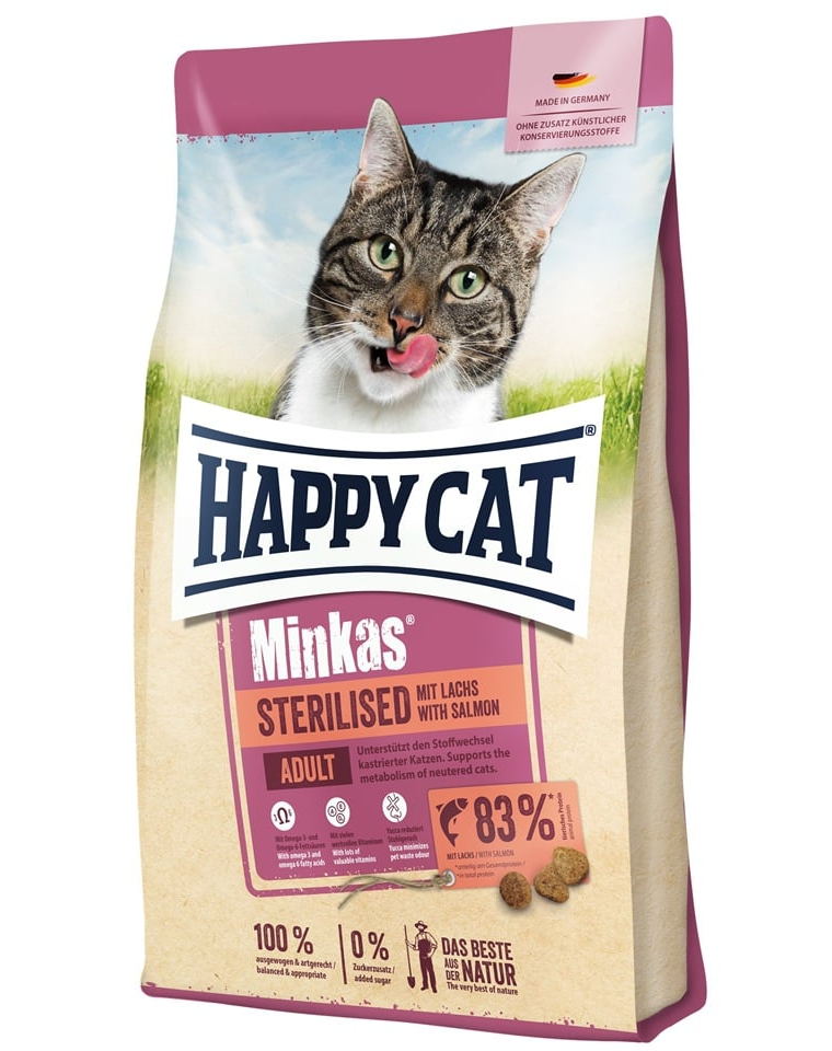 A Happy Cat Minkas Sterilised lazaccal ötvözi az ízletes ízt a csökkentett zsírtartalommal és a laktató rostok hozzáadásával, amelyek segítenek fenntartani a teltségérzetet és hatékonyan támogatják a testsúlykontrollt.