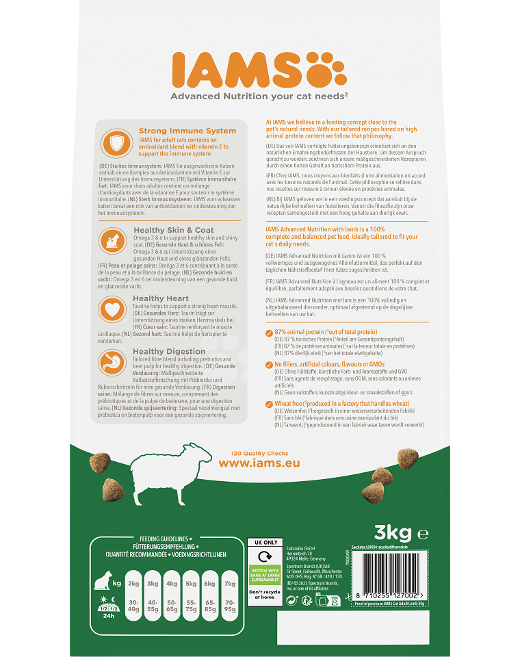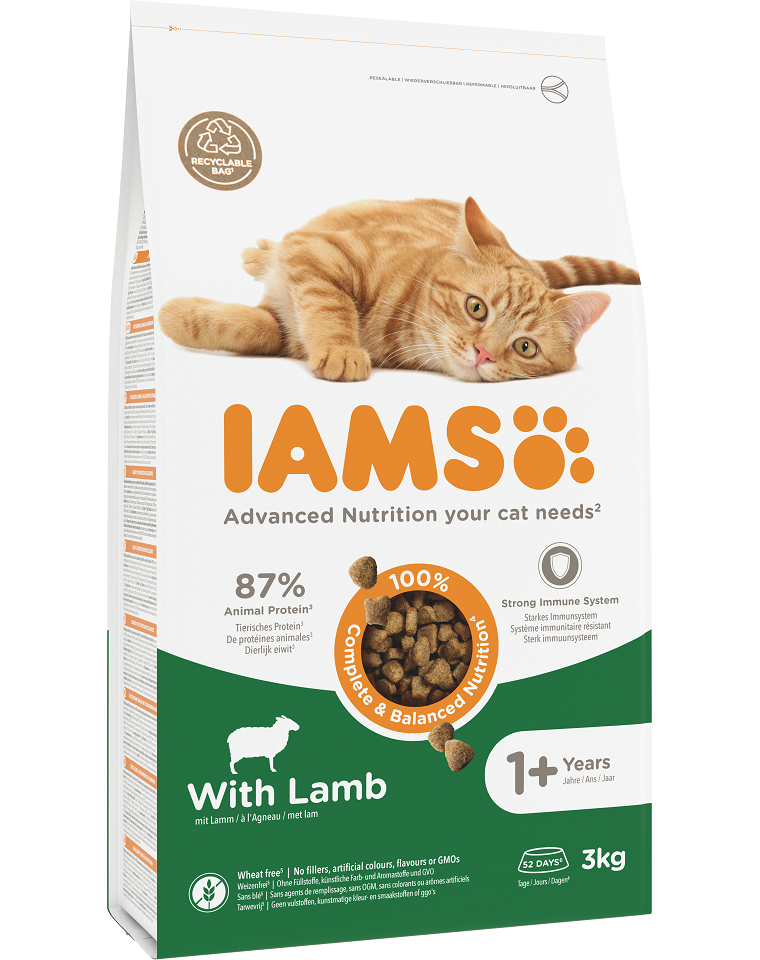 Az állati fehérjében gazdag IAMS for Vitality eledel 100%-ban teljes értékű és kiegyensúlyozott táplálék. A bárányhús magas tápértékű, könnyen emészthető fehérje, amely a szervezet számára az esszenciális aminosavak teljes készletét biztosítja. Az eledelben található csirke a macska idegrendszere számára különösen fontos B-vitaminok (niacin, riboflavin) forrása. Az IAMS for Vitality gazdag a szív- és érrendszer megfelelő működéséért felelős esszenciális zsírsavakban.