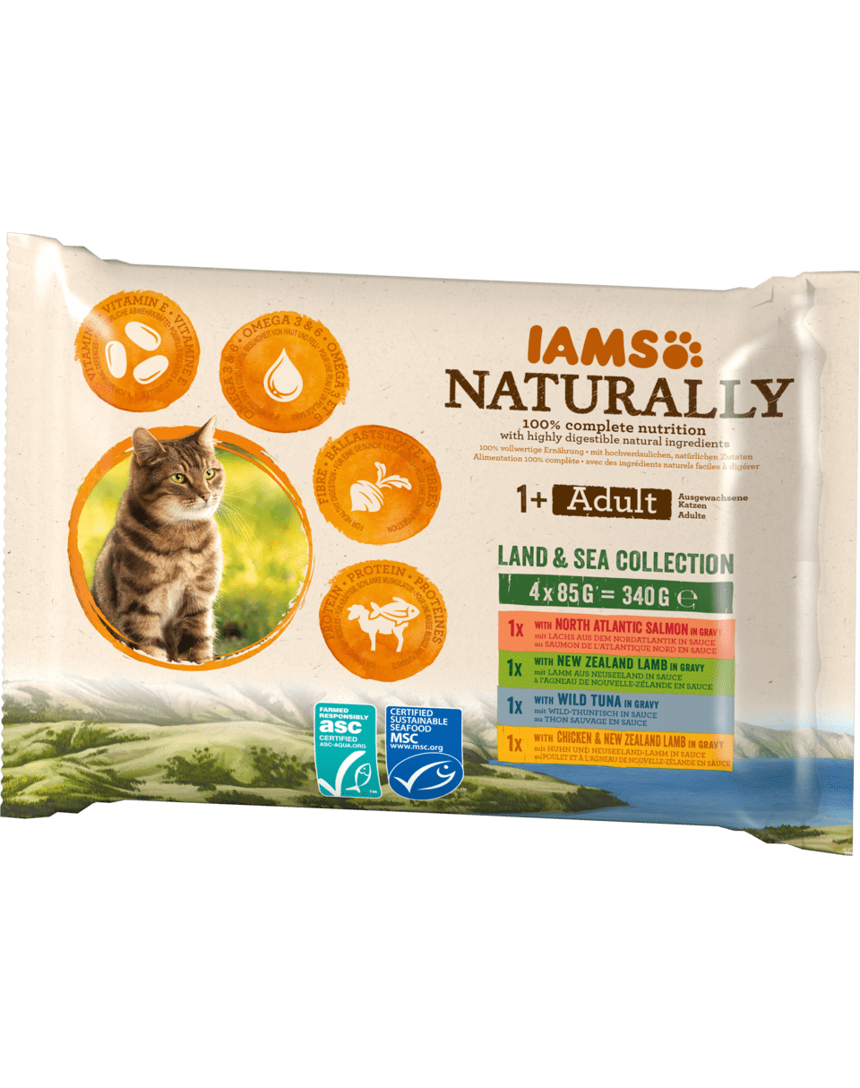 IAMS Naturally - Hús- és halízesítő készlet: Nedvestáp készlet felnőtt macskáknak ASC tanúsítvánnyal rendelkező észak-atlanti lazacot, új-zélandi bárányt, MSC tanúsítvánnyal rendelkező vad tonhalat, valamint új-zélandi csirkét és bárányt tartalmaz.