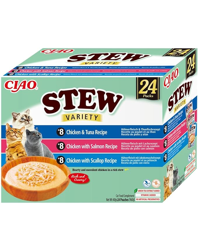 Az INABA Ciao Stew Creamy Variety egy prémium, valóban selymesen krémes, félfolyékony kiegészítő eledel macskáknak, amely finom húsdarabokat ötvöz krémes szószban. A gazdaságos, nagy kiszerelés (24 adag) három különböző, népszerű ízt rejt: csirke-tonhal, csirke-lazac és csirke-kagyló.