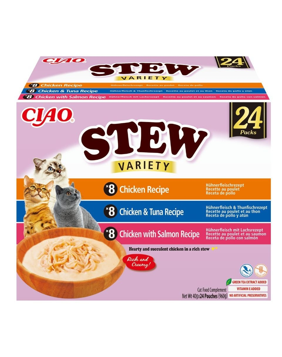 Az INABA Ciao Stew Variety egy különleges, félig folyékony, sűrűbb „stew” (pörkölt állagú) kiegészítő macskaeledel, igazi húsdarabokkal és természetes húslevesben. Ez a 24 tasakos gazdaságos csomag tökéletes több macskás háztartásokba, vagy azoknak a gazdiknak, akik minden nap szeretnék cicájuk étrendjét feldobni.