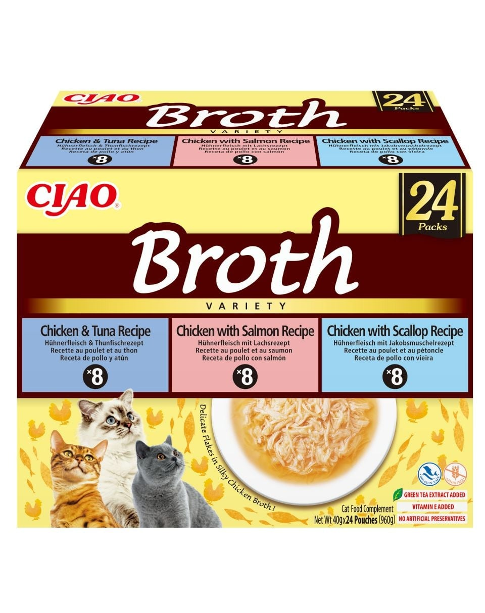 Az INABA Ciao Broth Variety egy gazdaságos kiszerelésű (24×40 g) kiegészítő, könnyű, bulionos macskaeledel, három ínycsiklandó változatban: csirke, hal és fésűkagyló. Ideális választás azoknak a gazdiknak, akik változatosságot szeretnének nyújtani kedvencüknek, és macskájuk imádja a Ciao Broth leveseket.