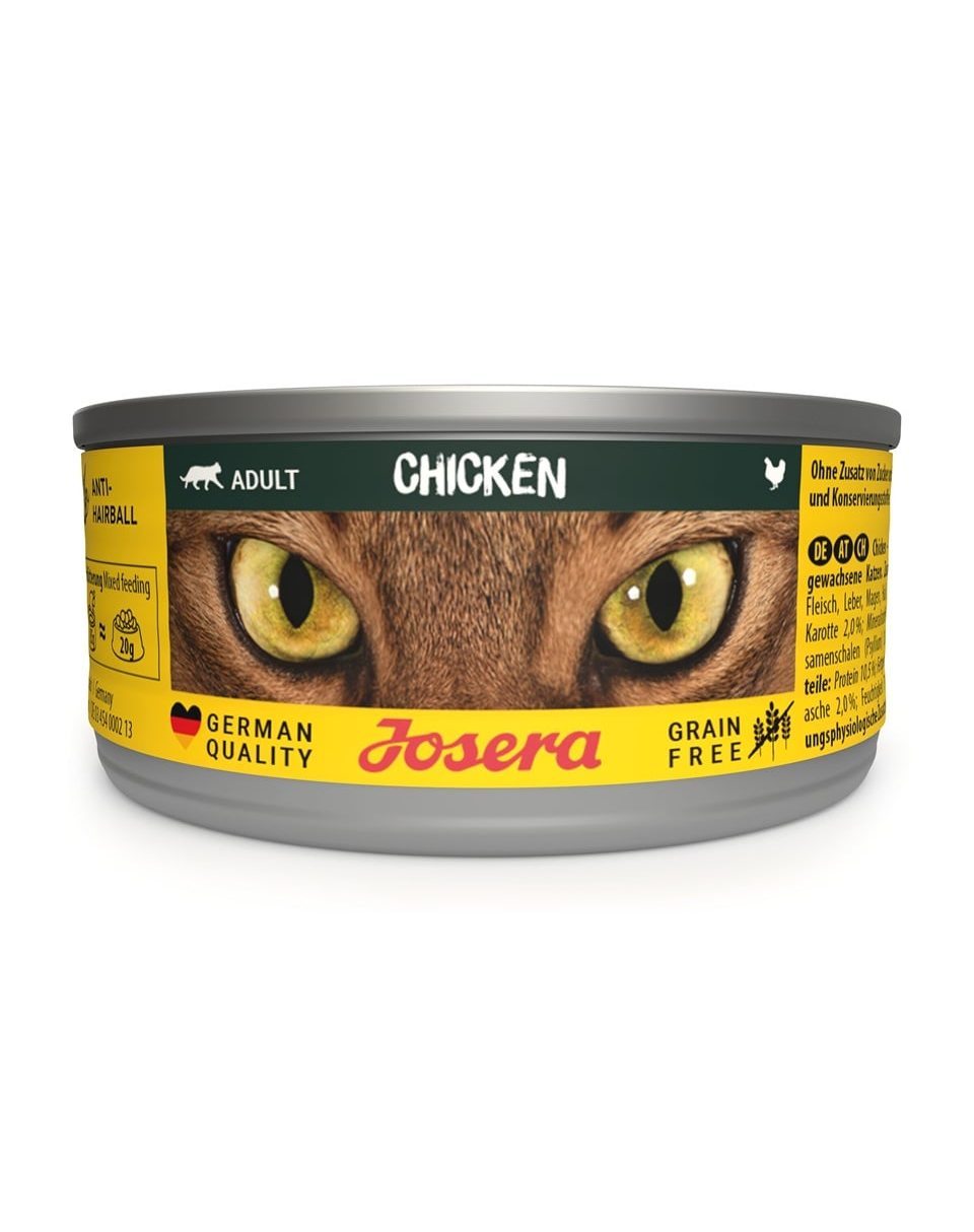 Mmm, itt az ideje egy ízletes változatosságnak! Új konzerv nedves macskaeledel választékunk még nagyobb választékot és még több ízt kínál a tálban. Kedvenced el lesz ragadtatva a Josera Chicken ízletes ételétől, amely finom csirkét tartalmaz. A gabonamentes receptúra lazacolajjal van gazdagítva, amely biztosítja a szükséges omega-3 zsírsavakat és fokozza az ízélményt.