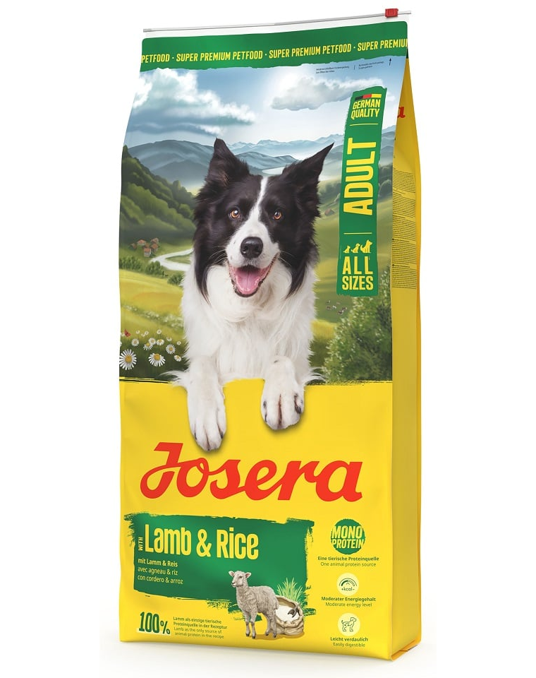 Josera Lamb & Rice egy finom, könnyen emészthető táp, amelyet a normál vagy alacsonyabb energiaszükségletű felnőtt kutyák számára fejlesztettek ki. A bárányhúsra alapozott monoprotein receptúra miatt a táp érzékeny emésztőrendszerű vagy ételallergiás kutyák számára is megfelelő. A mérsékelt energiatartalom és alacsony zsírtartalom miatt a Lamb & Rice kiváló választás a kevésbé aktív, idősebb vagy súlygyarapodásra hajlamos kutyák számára.