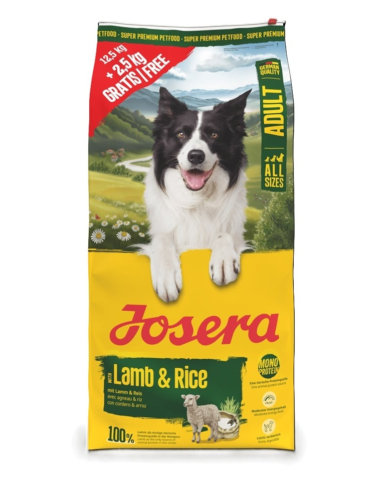 Josera Lamb & Rice egy könnyen emészthető, alacsony zsírtartalmú eledel, alacsony fehérjetartalommal és mérsékelt energiatartalommal. Ideális kutyák számára, akiknek alacsonyabb vagy normál energiaszükségletük van. Ezért ideális a kevésbé aktív négylábú barátaink számára.