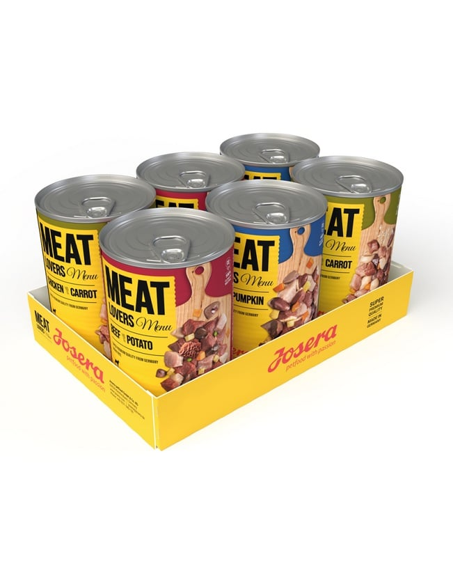 A JOSERA Meat Lovers Menu Multipack 6 konzervből álló válogatás, 3 ízletes, húsos változatban: