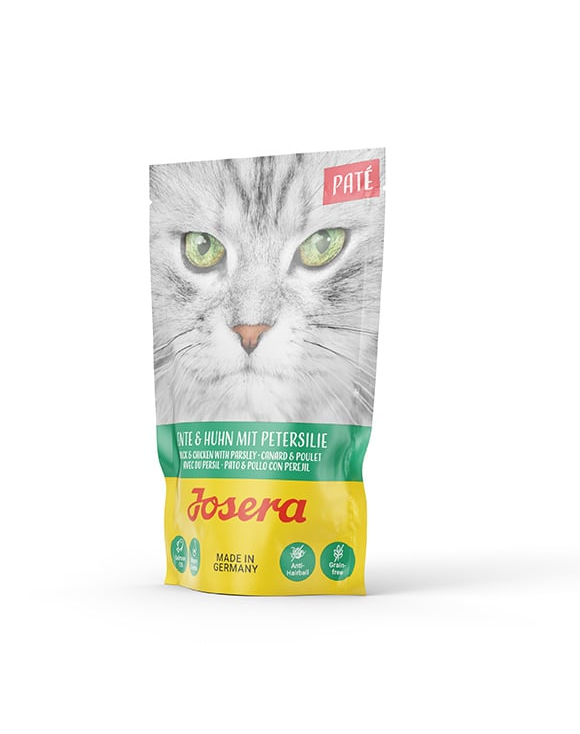 A pástétom formája a legigényesebb macskák számára is ízletes. A takarmány kacsa- és csirkealapú, belsőségekkel kiegészítve.
