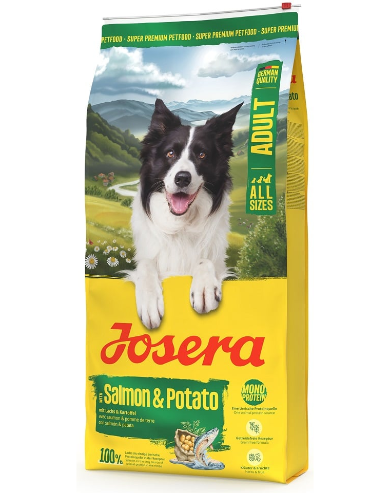 Josera Salmon & Potato egy különleges száraz táp, amelyet kifejezetten érzékeny gyomrú felnőtt kutyák számára fejlesztettek ki. Az egyetlen állati fehérjeforrásra – lazacra épülő receptúra különösen jól tolerálható. A lazac nemcsak teljes értékű fehérjét biztosít a kutyának, hanem gazdag omega-3 zsírsavforrás is, amely támogatja az egészséges bőrt és a fényes szőrt.